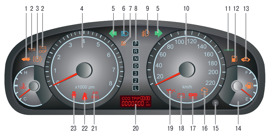 1 - сигнализатор незакрытой крышки багажника; 2 - сигнализаторы системы курсовой устойчивости (TSC); 3 - сигнализатор неисправности антиблокировочной системы тормозов ABS; 4 - тахометр; 5 - сигнализатор указателей поворота; 6 - сигнализатор включения дальнего света фар; 7 - сигнализатор включения повышающей передачи (для автомобиля с двигателем G4ED); 8 - сигнализатор положения селектора АКП; 9 - сигнализатор включения передних противотуманных фар; 10 - спидометр; 11 - сигнализатор системы круиз-контроля; 12 - сигнализатор резерва топлива; 13 - сигнализатор иммобилизатора; 14 - указатель уровня топлива; 15 - кнопка сброса счетчиков пробега; 16 - сигнализатор неисправности системы управления двигателем; 17 - сигнализатор включения стояночного тормоза и недостаточного уровня тормозной жидкости; 18 - сигнализатор разряда аккумуляторной батареи; 19 - сигнализатор недостаточного давления в системе смазки двигателя; 20 - жидкокристаллический дисплей (показания одометра и суточного пробега); 21 - сигнализатор системы безопасности SRC; 22 - сигнализатор не пристегнутого ремня безопасности; 23 - сигнализатор незакрытой двери; 24 - указатель температуры охлаждающей жидкости
