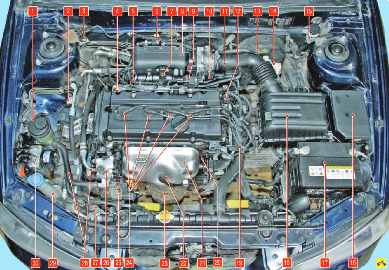 1 - бачок гидроусилителя рулевого управления; 2 - датчик давления в системе кондиционирования; 3 - датчик ускорения автомобиля (для двигателя G4ED); 4 - крышка головки блока цилиндров; 5 - топливная рампа; 6 - клапан продувки адсорбера; 7 - комбинированный датчик абсолютного давления (разрежения во впускной трубе) и температуры всасываемого воздуха; 8 - впускная труба; 9 - регулятор холостого хода; 10 - датчик положения дроссельной заслонки; 11 - воздухоподводящий рукав; 12 - датчик положения распределительного вала (датчик фазы); 13 - вакуумный усилитель тормозов; 14 - бачок гидропривода тормозов; 15 - бачок гидропривода выключения сцепления; 16 - монтажный блок предохранителей и реле; 17 - аккумуляторная батарея; 18 - воздушный фильтр; 19 - катушка зажигания; 20 - датчик положения коленчатого вала; 21 - термоэкран катколлектора; 22 - датчик (управляющий) концентрации кислорода; 23 - катколлектор; 24 - высоковольтные провода; 25 - генератор; 26 - насос гидроусилителя рулевого управления; 27 - расширительный бачок системы охлаждения двигателя; 28 - трубопроводы системы гидроусилителя рулевого управления; 29 - наливная горловина бачка омывателя ветрового стекла; 30 - гидроэлектронный блок АBS