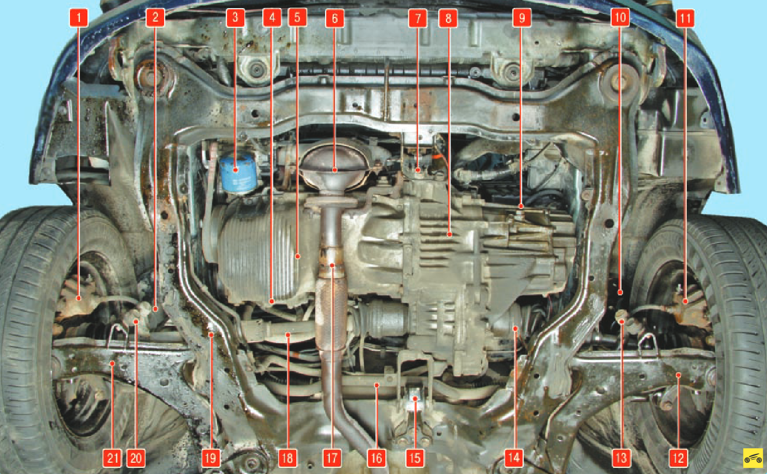 1, 11 – тормозные механизмы передних колес; 2, 10 – амортизаторные стойки передней подвески; 3 – масляный фильтр; 4 – пробка отверстия для слива масла двигателя; 5 – двигатель; 6 – катколлектор (нейтрализатор отработавших газов, объединенный с выпускным коллектором); 7 – передняя опора подвески силового агрегата; 8 – коробка передач; 9 – пробка отверстия для контроля уровня масла в коробке передач; 12,21 – рычаг передней подвески; 13, 20 – стойка стабилизатора поперечной устойчивости передней подвески; 14, 18 – приводы передних колес; 15 – задняя опора подвески силового агрегата; 16 – штанга стабилизатора поперечной устойчивости; 17 – приемная труба системы выпуска отработавших газов с сильфоном; 19 – подрамник передней подвески