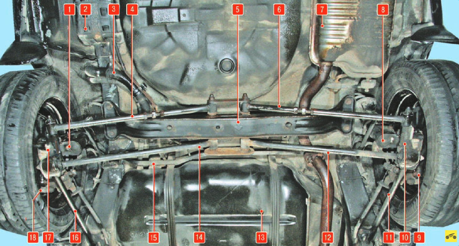 1, 8 – амортизаторные стойки задней подвески; 2 - адсорбер; 3 - наливная труба топливного бака; 4, 6 - задние поперечные рычаги задней подвески; 5 - поперечина задней подвески; 7 - основной глушитель; 9, 18 - тормозные механизмы задних колес; 10, 17 - кулак задней подвески; 11, 16 - продольный рычаг задней подвески; 12, 14 - передний поперечный рычаг задней подвески; 13 - топливный бак; 15 - штанга стабилизатора поперечной устойчивости задней подвески