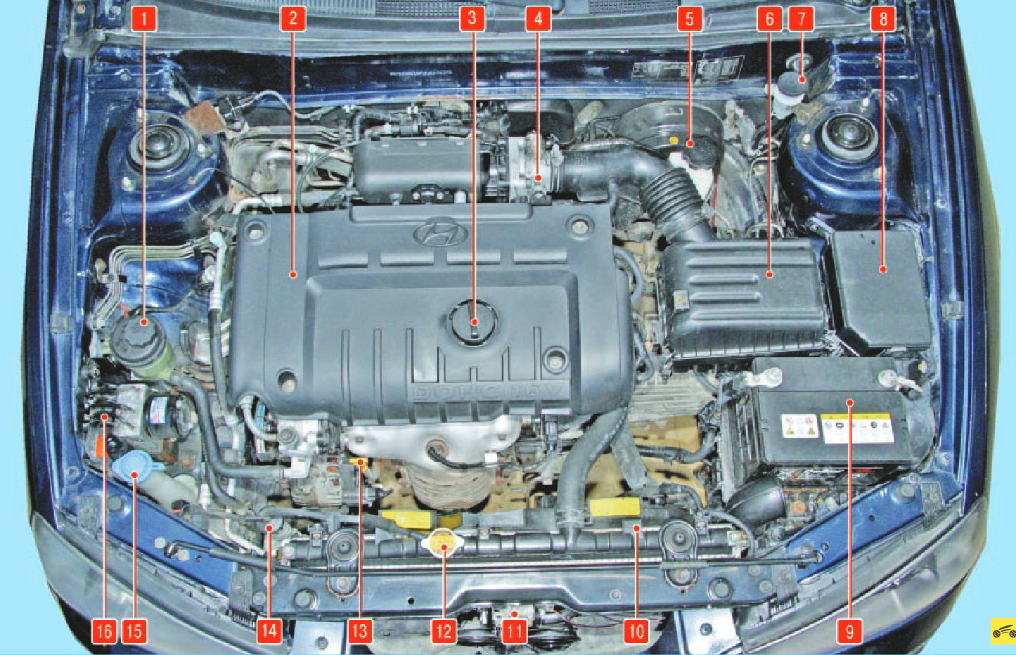 1 - пробка бачка гидроусилителя рулевого управления; 2 - декоративный кожух двигателя; 3 - пробка маслоналивной горловины; 4 - дроссельный узел; 5 - пробка бачка гидропривода тормозов; 6 - воздушный фильтр; 7 - пробка бачка гидропривода выключения сцепления; 8 - монтажный блок предохранителей и реле; 9 - аккумуляторная батарея; 10 - радиатор системы охлаждения двигателем; 11 - замок капота; 12 - пробка радиатора системы охлаждения двигателя; 13 - указатель (щуп) уровня масла; 14 - пробка расширительного бачка системы охлаждения двигателя; 15 - пробка наливной горловины бачка омывателя стекла ветрового окна; 16 - гидроэлектронный блок АBS